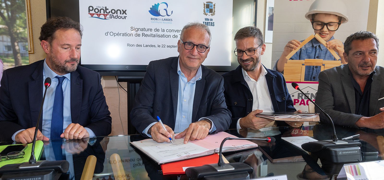 C’est la première fois dans les Landes qu’une Opération de revitalisation du territoire (ORT) est signée par une Communauté de communes. Cette convention, qui définit un certain nombre d’actions pour rendre plus attractifs les centres-bourgs, est généralement utilisée par les communes éligibles au programme Petites Villes de demain. Il y en a 14 dans les Landes, mais Pontonx-sur-l’Adour, Rion-des-Landes et Tartas, les trois principaux pôles urbains du Pays Tarusate – environ 3 000 habitants chacun – n’en font pas partie. La Communauté de communes a donc opté pour une ORT multisites qui a été signée le 22 septembre avec l’État, le Département des Landes et la Banque des territoires.