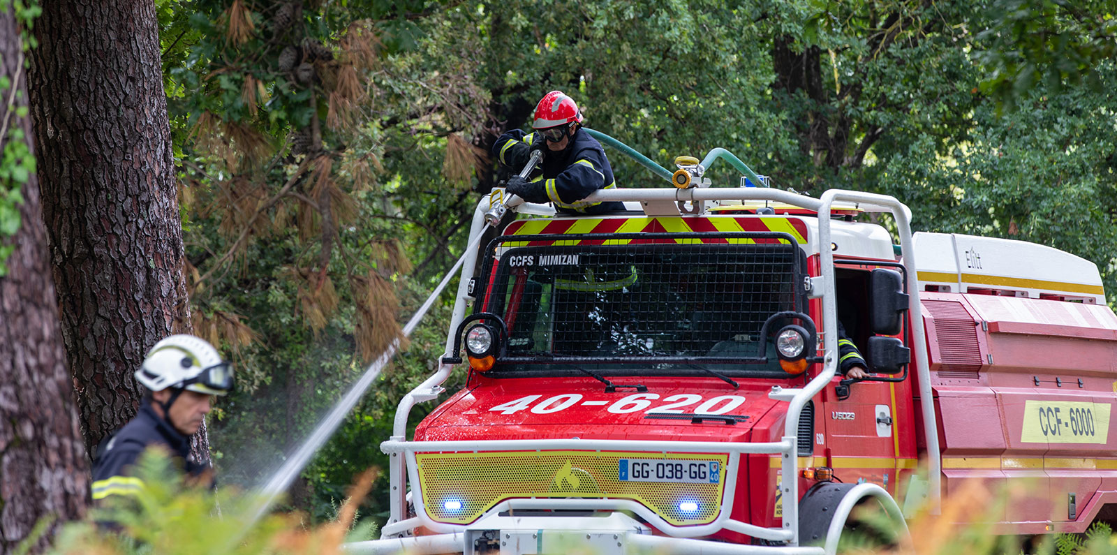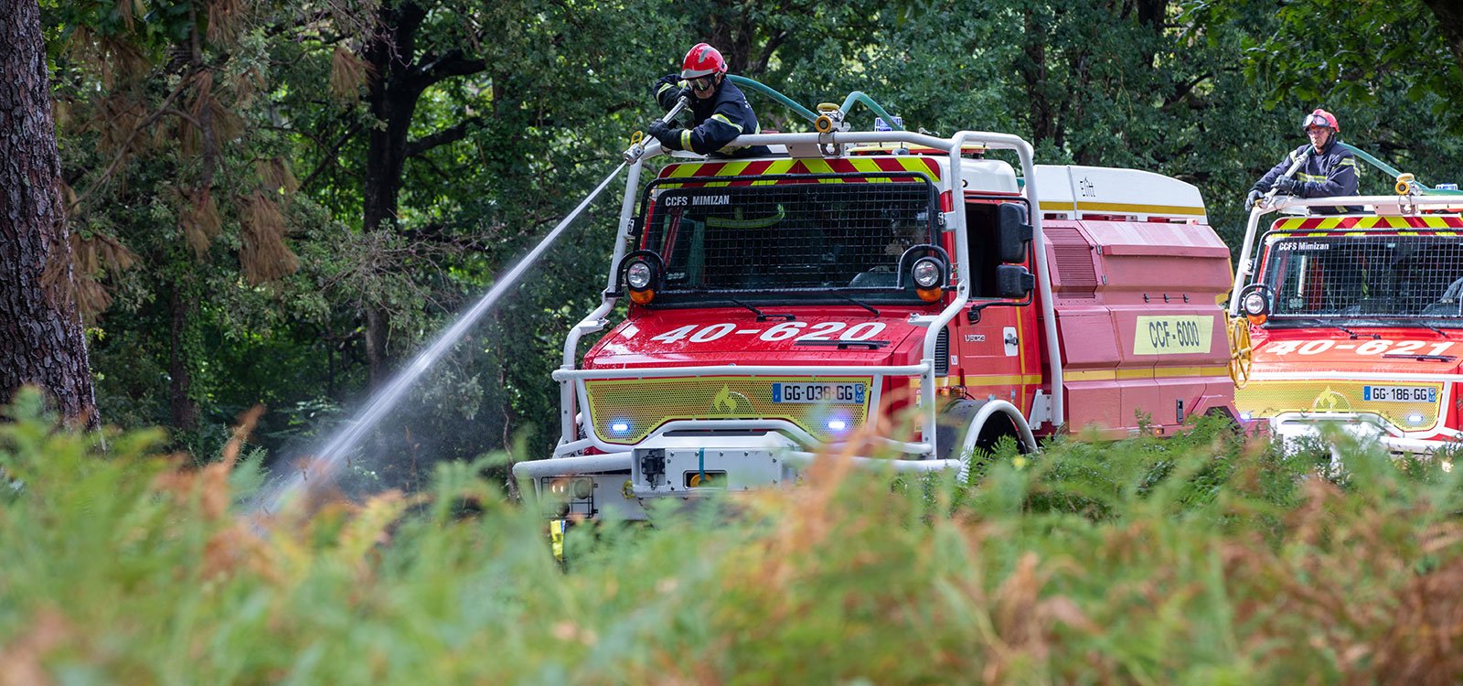 Les fameux camions citernes feux de forêt (CCF) embarquent 6 000 litres d'eau pour une heure d'attaque. Dans une spécificité landaise, commente l'adjudant-chef Pierre Guillet qui a démarré sa carrière en 1992 avec Vincent Castagnède à Uza à l'époque où il y avait là 9 professionnels à l'année, « on va chercher le feu avec le camion qui peut coucher des pins de 15 ans pour avancer au plus près. Les équipiers sont toujours deux, côte à côte : le conducteur et celui dans le trou d'homme avec sa lance ». Un esprit de corps intact, forgé dans l'adversité des grands feux, le quotidien des interventions, dans une tradition de service public exigeante.